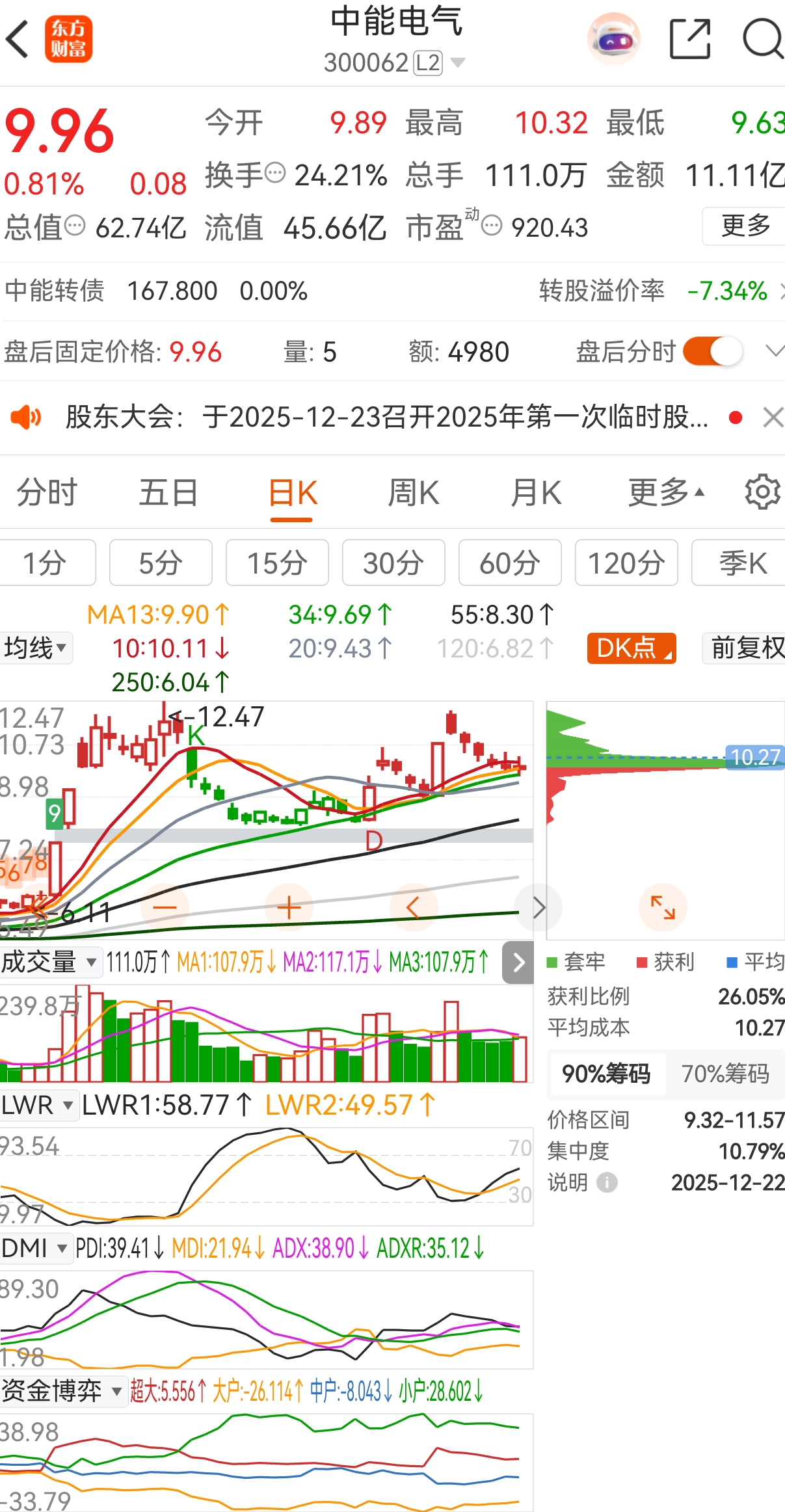 中能电气:放量假阴真阳后,四串阴干到了 13 线,今天收阳星止跌信号,是个买点。看前大阳高度,不过分吧?