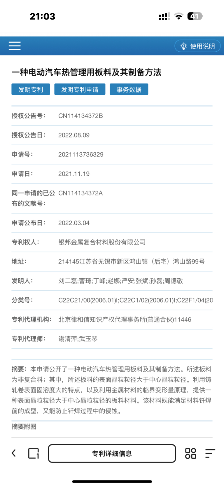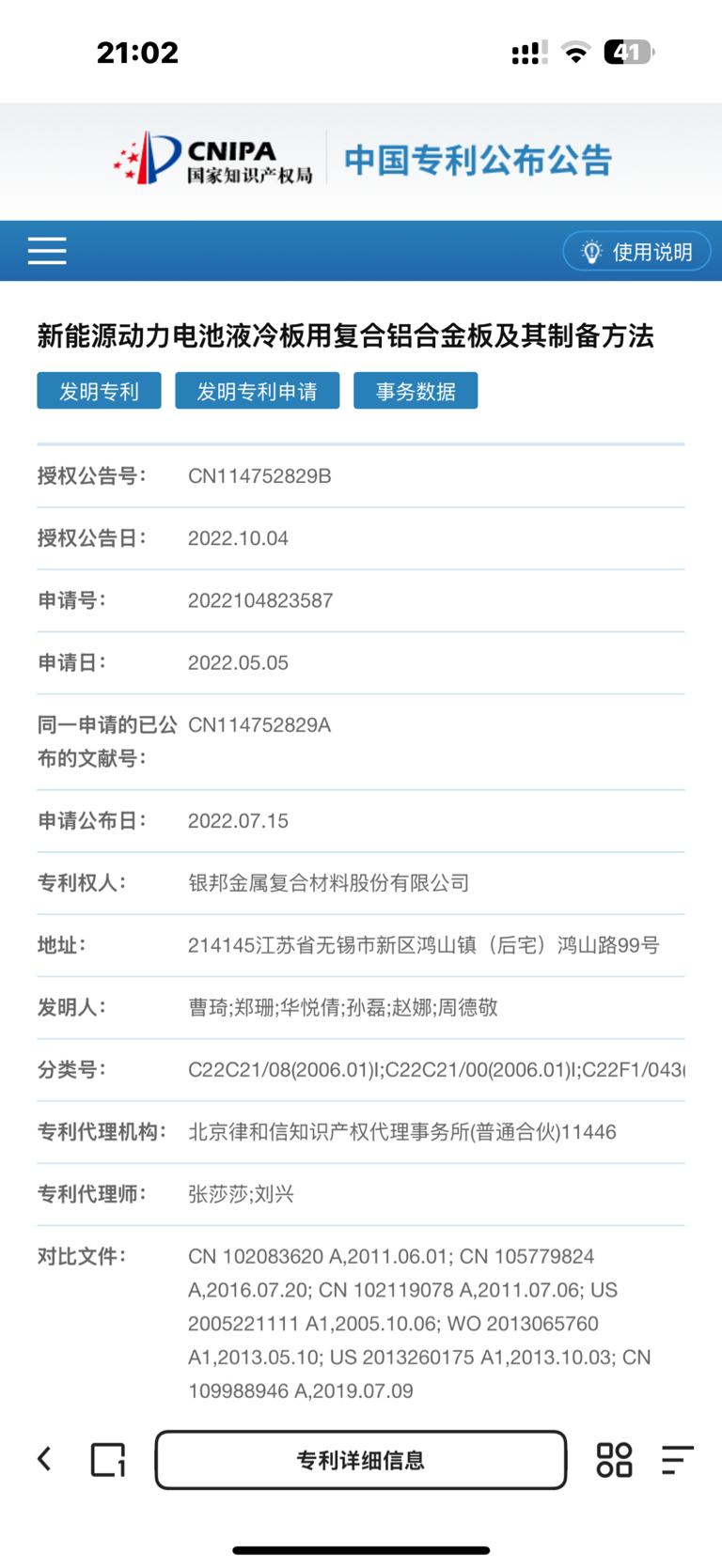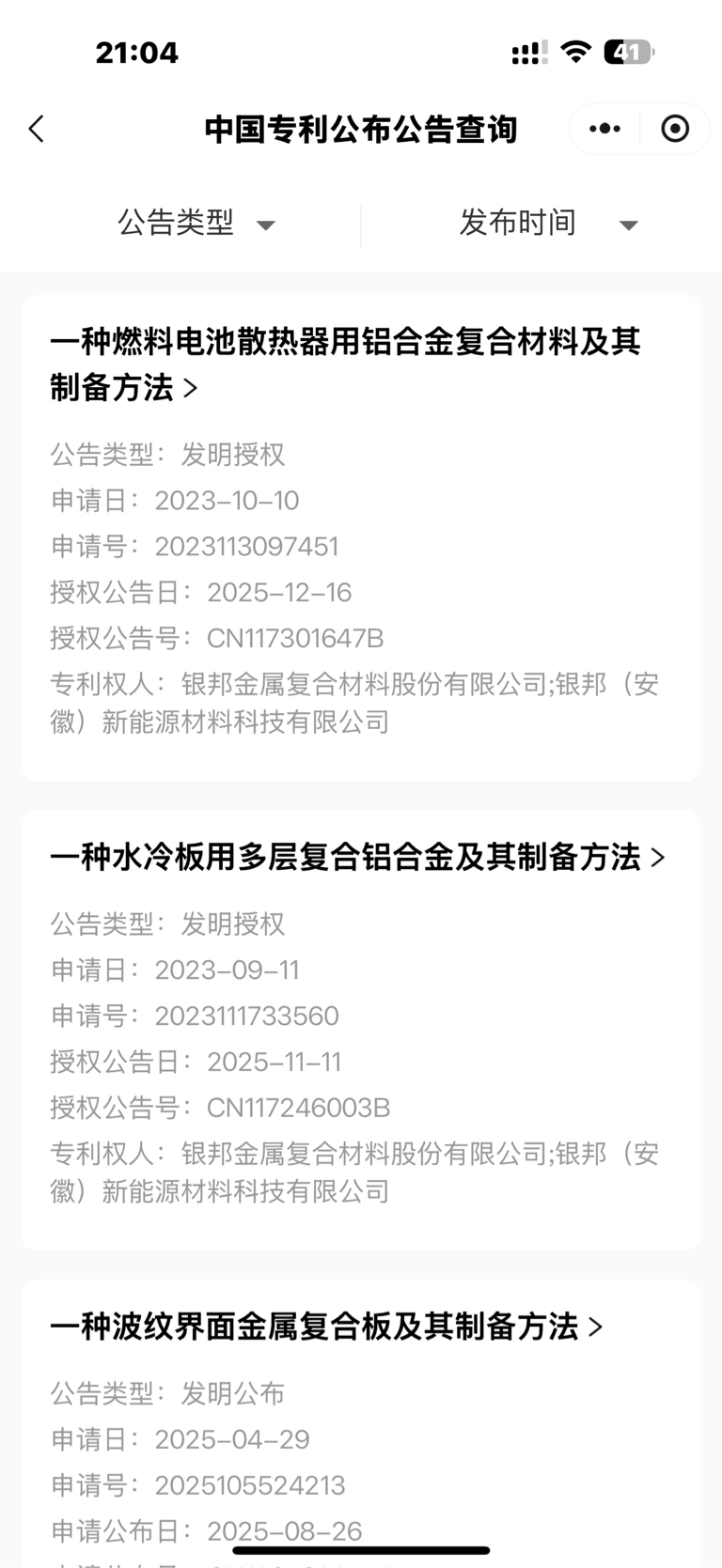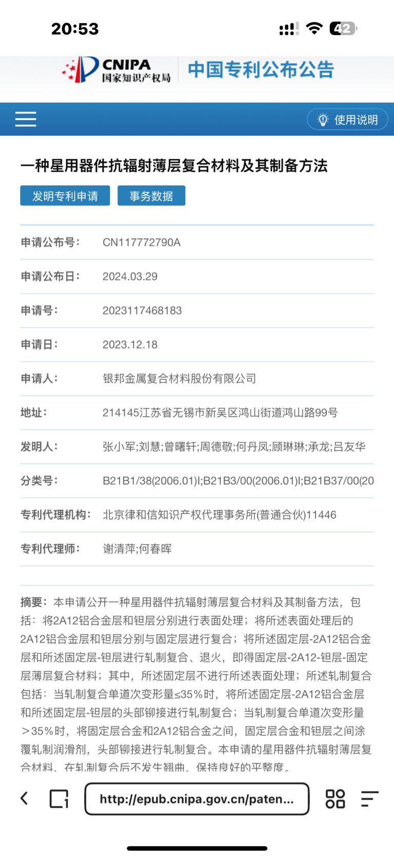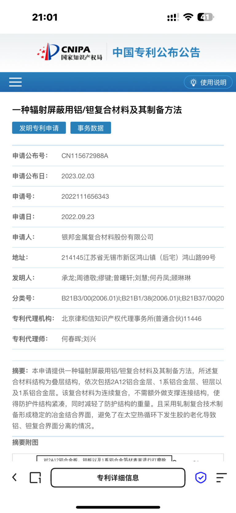 查询方法也简单,搜中国专利公布公告查询,搜关键词银邦金属复合材料,就出来了,专利有很多,就不一一列举了!