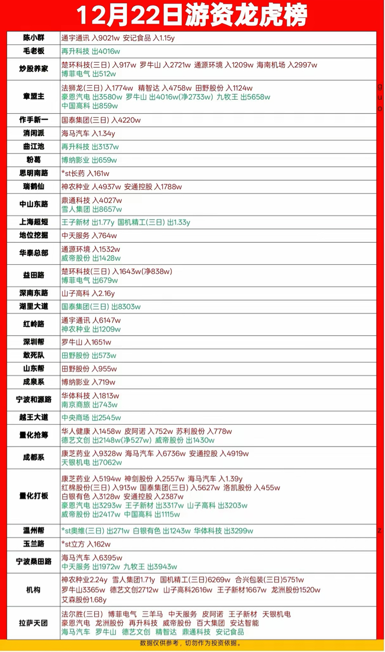 12月22日游资动作频频,各路资金布局方向差异明显。陈小群出手通宇通讯(入9021w)、安记食品(入1.15y),手笔颇为亮眼;炒股养家则布局楚环科技(三日入917w)、罗牛山(入2721w)等多只标的,同时博菲电气出512w。