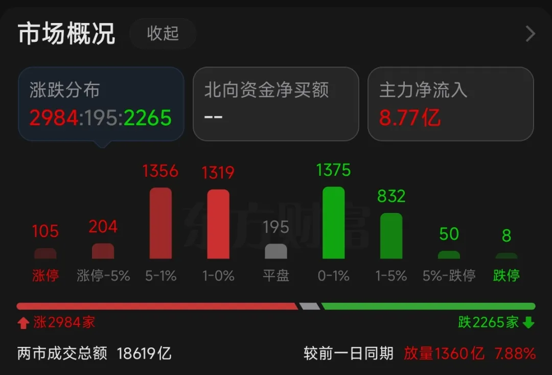 今天大盘两市成交总额1.8万多亿,放量1300多亿,红盘29000多家,盈利效应一般。