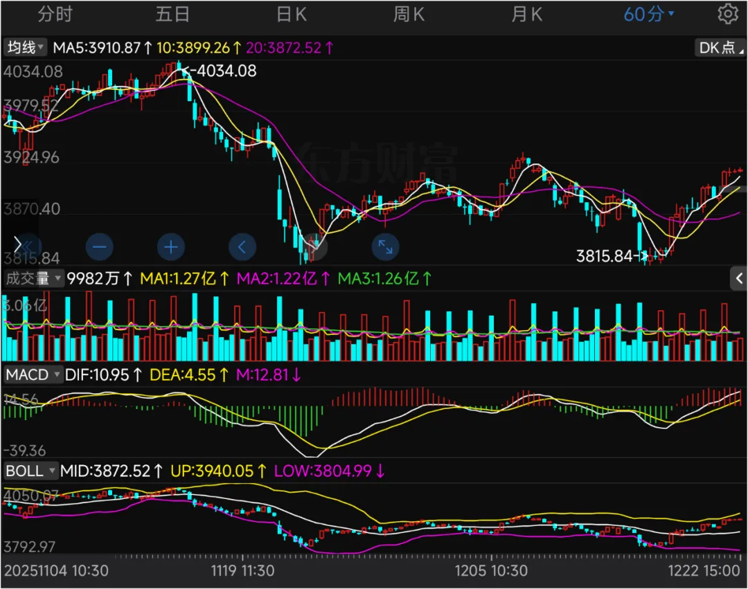技术面上以上证60分钟K线作为参考,尾盘有滞涨趋势。