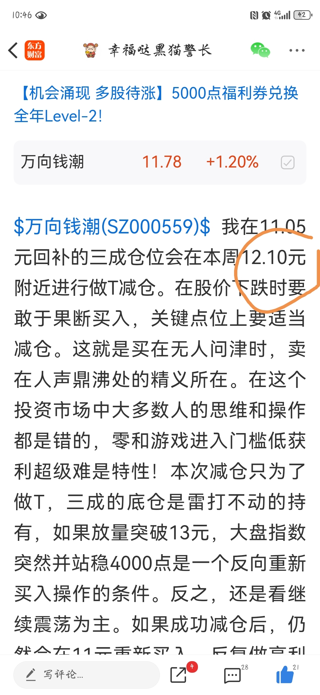 上图是我昨天股吧里发出的帖子,上面明确的说到了减仓做T的具体位置以及时间的一些预判和操作计划!严守操作计划,知行合一在投资市场里尤为重要!本人基本上很少在盘中做出临时性买卖操作,这是为了避免人性带来的贪婪与恐惧的弱点。控盘机构最害怕的就是你不去看盘且有逻辑性的操作计划!我在12.10元把之前在10.90元附近回补的三成仓位卖出,目前持有三成底仓观察。预计年底万向钱潮大概率是继续横盘震荡整理,如要突破也许放在明年会比较合理。这一次的做T又成功的把总成本进一步降低了。后期的操作计划是股价回落到11.10元附近会重新回补三成仓位,如果万向钱潮放量突破13元且大盘指数突破并站稳4000点,将会反向进行加仓!