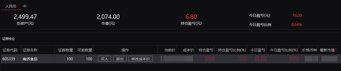 2.当日嬴亏:16元