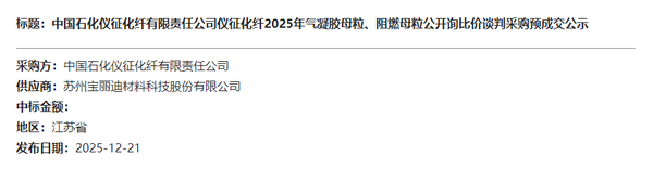 证券之星消息,根据天眼查APP-财产线索数据整理,根据中国石化仪征化纤有限责任公司12月21日发布的《中国石化仪征化纤有限责任公司仪征化纤2025年气凝胶母粒、阻燃母粒公开询比价谈判采购预成交公示》内容显示,苏州宝丽迪材料科技股份有限公司中标,详情如下: