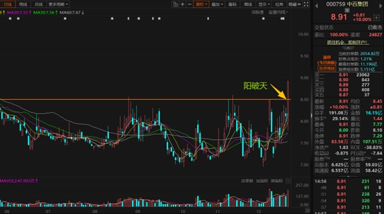 2)$中百集团(SZ000759)$ :武汉国资委控股,今天这根涨停收上来,则又明确地形成阳顶天走势!