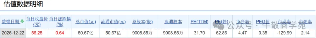 2025年12月22日,华光新材(688379)收盘价56.25元/股,涨跌幅0.64%,市盈率(TTM)31.70倍,市净率4.47倍,市销率2.14倍,市值50.67亿元。