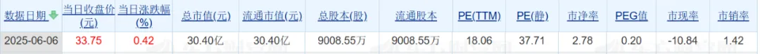 2025年6月6日,华光新材(688379)收盘价33.75元/股,涨跌幅0.42%,市盈率(TTM)18.06倍,市净率2.78倍,市销率1.42倍,市值30.40亿元。