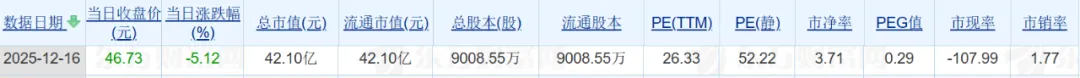 2025年12月16日,华光新材(688379)收盘价46.73元/股,涨跌幅-5.12%,市盈率(TTM)26.33倍,市净率3.71倍,市销率1.77倍,市值42.10亿元。