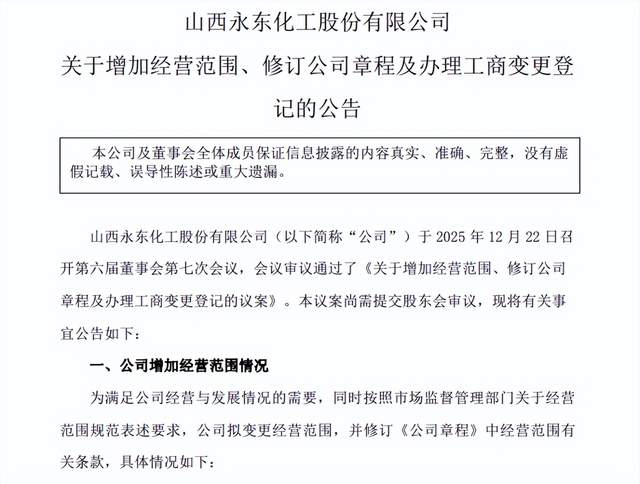 12月22日,山西A股上市公司永东股份(002753.SZ)发布公告,公司拟增加经营范围,将新能源充电服务纳入业务布局范畴。