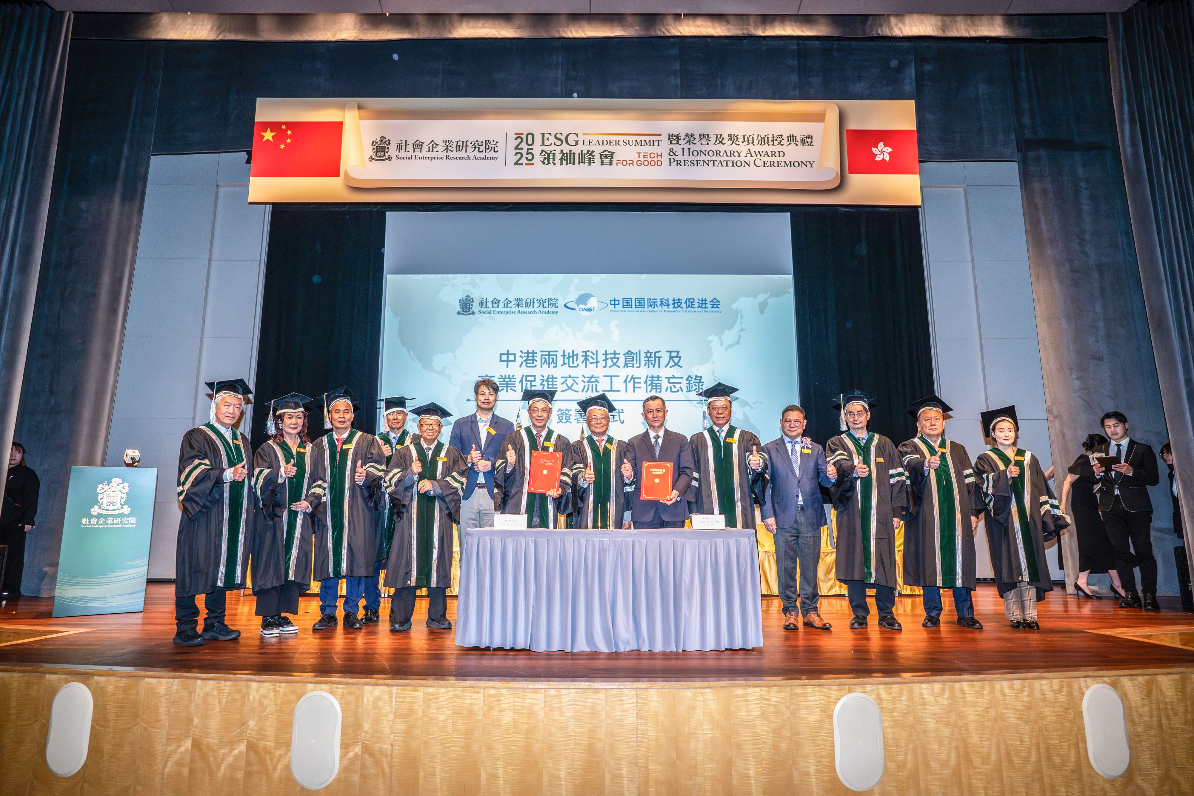 在2025 ESG领袖峰会上,第十四届全国政协常委、香港特区行政会议成员高永文出席会议并致辞。中国价格协会数据价格专业委员会会长宋晓伟、腾讯SSV数字教育实验室及腾讯公益数字化平台运营总监严霁玥等嘉宾围绕科技与产业深度融合、互联网科技驱动人才培养与公益等议题展开分享。期间,香港社会企业研究院与中国国际科技促进会智慧科技工作委员会共同签署了《中港两地科技创新及产业促进交流工作备忘录》,旨在汇聚双方资源优势,共同推动内地与香港的科技创新与社会经济发展。