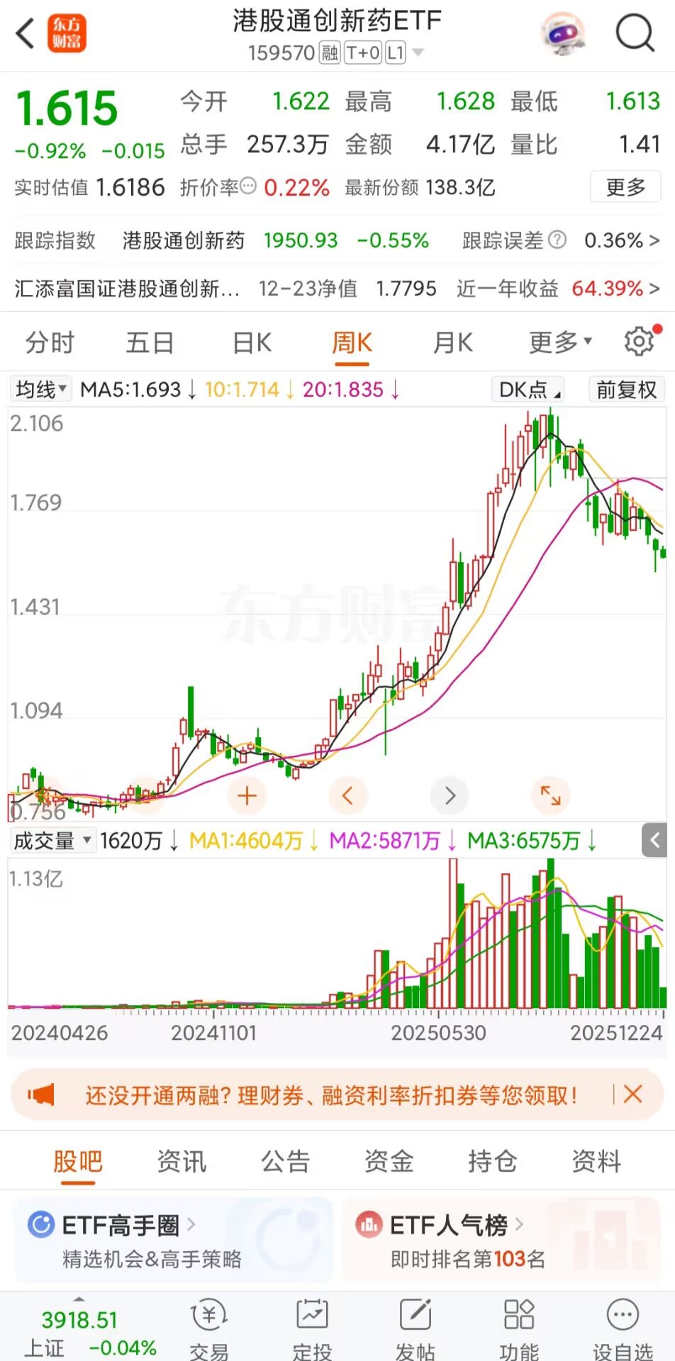 所以综合来看,我认为想要博明年春季反弹行情,提前埋伏港股创新药是一个不错的选择,当然,当前市场上港股创新药的品种也不少,我注意到汇添富国证港股通创新药指数配置非常鲜明,100%创新药含量,$港股通创新药ETF(SZ159570)$自9月以来进入横盘震荡期,弹性相对变为平稳;对于短期涨幅预期可以适当降低。但相较三年的跌幅,当前港股创新药仍处于较高性价比,并且港股通创新药ETF(159570)这只场内基金在交易时间内随时可以买卖,非常的灵活方便,综合费用还比较低,目前我已经将其加入自选,计划在这两天就开始配置。