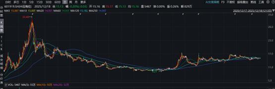 01 割裂的周期从近5年的股价走势来看,如果不考虑股息,中远海控经历了急剧拉涨,快速下跌到震荡修复的过程。高峰时股价33.4元,截至25年12月23日收盘15.4元,高点至今已下跌近55%。