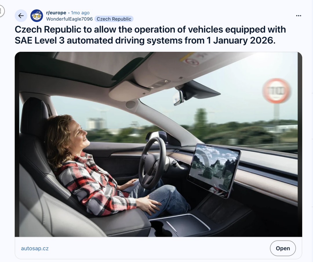 以捷克为例,2026 年 1 月 1 日,捷克也会启用 L3 级无监督自动驾驶。