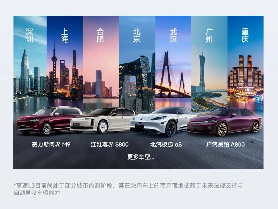 年底华为会开启 4 款车型高速 L3 内测的车型包括:赛力斯问界 M9、江淮尊界 S800、极狐阿尔法 S、广汽昊铂 A800。而这些车型均使用了乾崑智驾 ADS4。