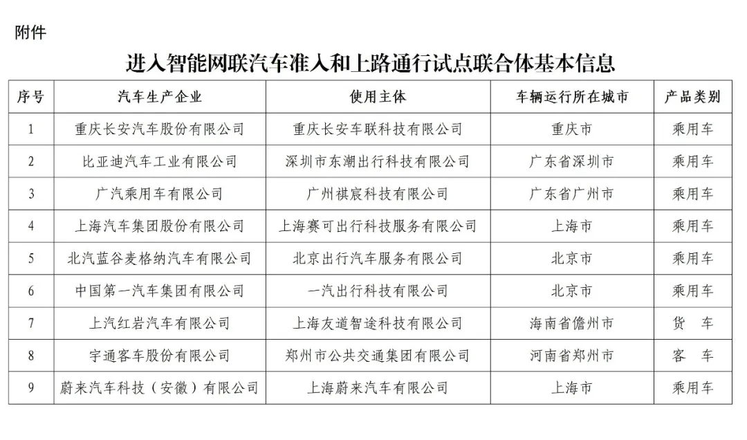 后者的全称为《智能网联汽车准入和上路通行试点联合体试点名单》,该名单是 2024 年由工信部主导,四部门联合审批确认。这个名单上其实只有九家联合体。