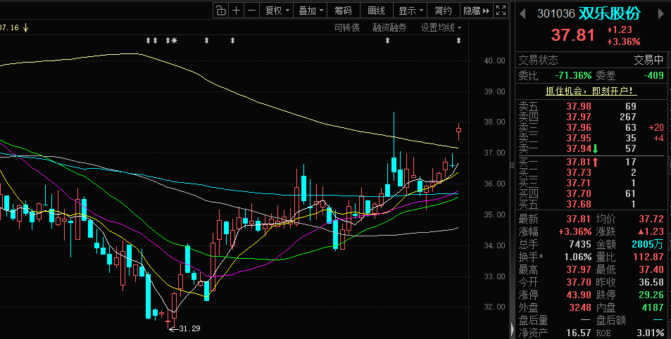 $双乐股份(SZ301036)$总股本仅有1亿,股性十分活跃,在配售资金推动下,股价出现较大的高开,突破年线压制,恭喜持有的DD吃肉,配债不是目的,只是套利的一种方式,稳健者可以逢高离场。