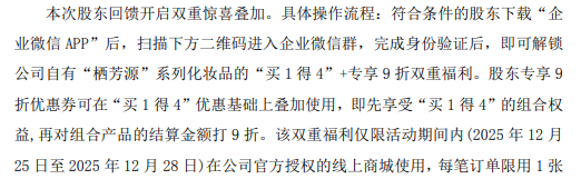 符合条件的投资者,可以在2025年12月25日~18日,通过相关股东认证之后,即可解锁东北制药自有“栖芳源”系列化妆品的“买 1 得 4”+专享9 折双重福利,需要的DD不要错过哦。