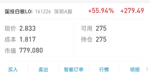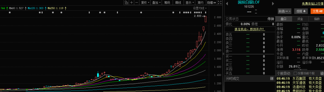 国投白银LOF:白银期货带动下,股价连续两日涨停,创出历史新高,目前溢价率高达55%,周一场内申购,现在卖出的套利者赢麻了,与此相似的还有黄金LOF(两者都限购,现在风险较大)