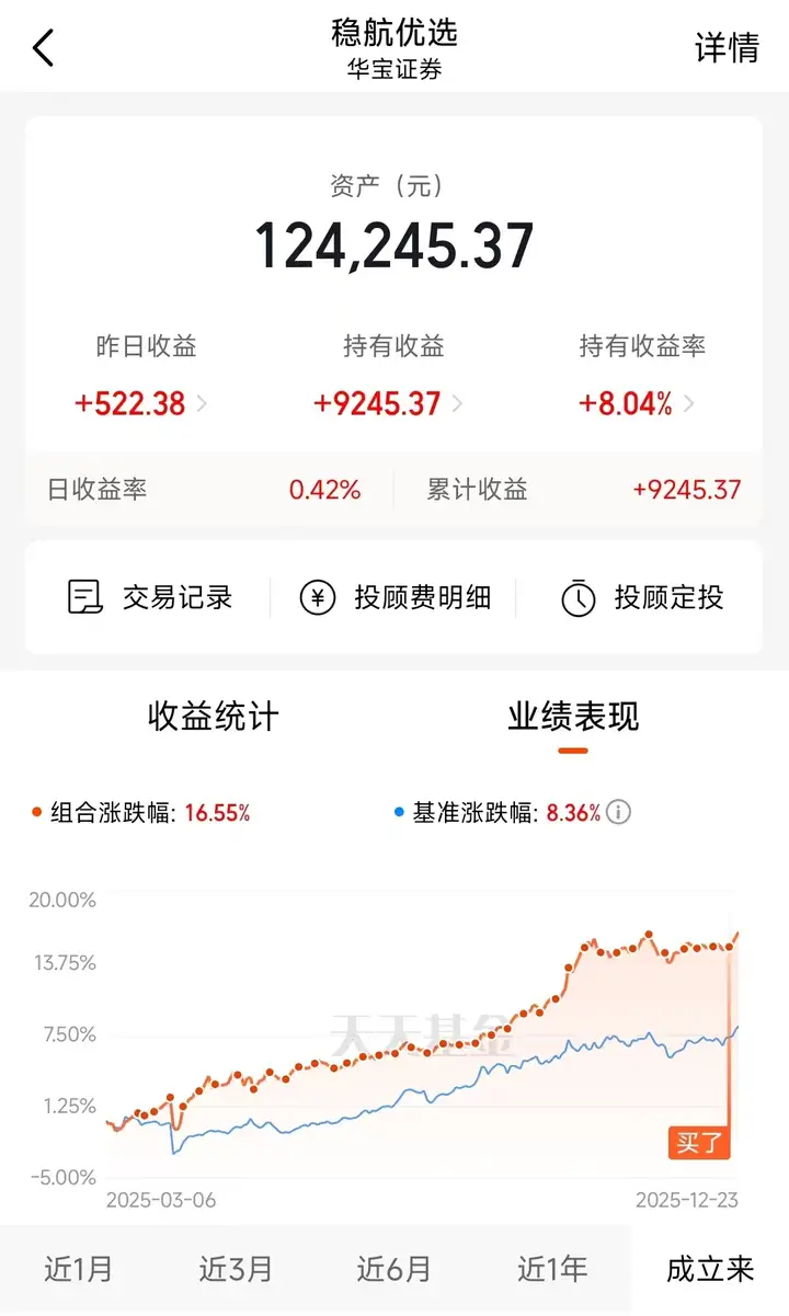 【稳航优选】是风格偏稳健的基金投顾组合,底层持仓包括股票基金、商品基金和债券基金,基本上和我目前的风格类似,唯一不同的是该组合债券持仓占比达到了40%,总体来看应该是更稳健一点,更适合长期持有。