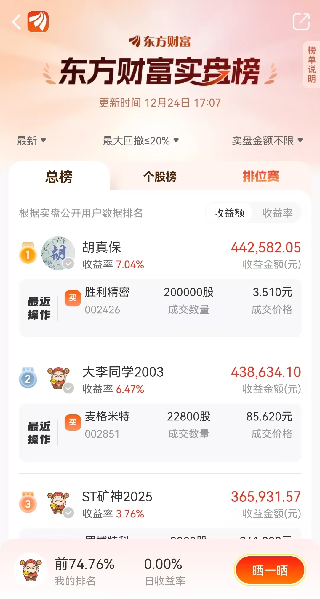 当前A股的持续反弹,市场热点变化轮动,难以支撑市场形成全面上涨的行情,更多还是结构性机会的演绎。东财实盘榜上,神秘高手们又是如何布局的,明日是否可以抄作业?最新收益额榜前三名如下:
