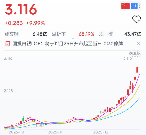 今天的白银LOF的继续涨停,溢价率超过昨天的52%去到68.19%,奔着70%去了。基金净值是1.85,但二级市场直接抬到了3.11。现在投机博傻的人太多了,已经把这个LOF当meme来炒了。$国投白银LOF(SZ161226)$