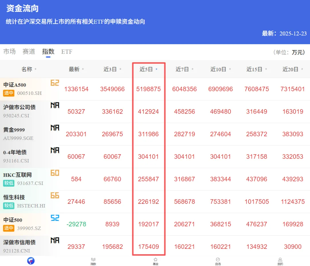 临近年末,中证A500的跟踪基金规模突然爆发了,近5个交易日ETF资金净申购520亿元,近10日净申购691亿元,遥遥领先其他指数。