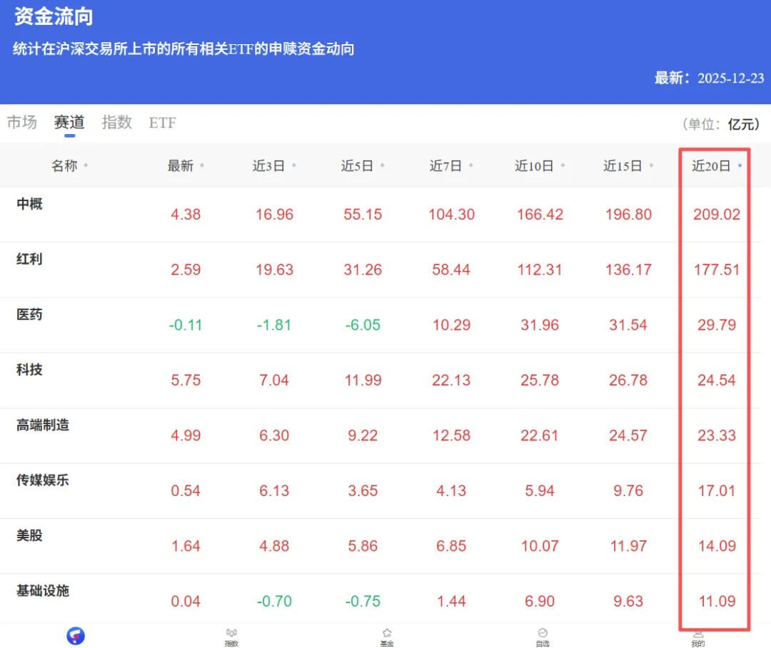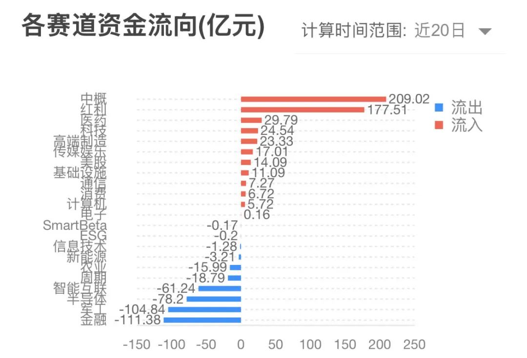 其他赛道的资金流入均不明显,比如排名第3的医药,近20日累计净流入也只有29.79亿元。