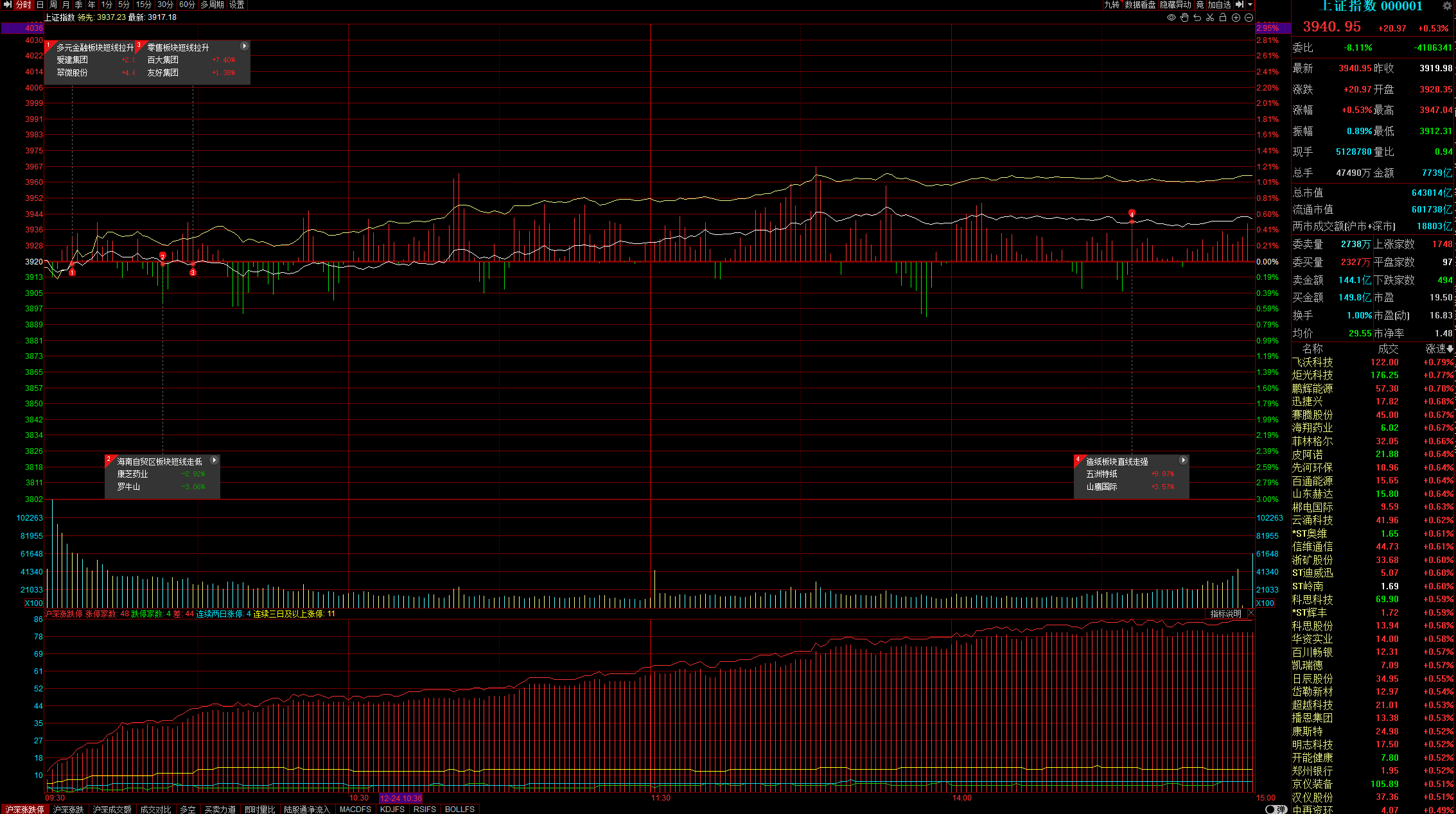 今天大盘小幅开涨后震荡走高。截至收盘,上证指数收涨0.53%,深证成指收涨0.88%,创业板指收涨0.77%。电源设备板块全天强势,消费电子板块震荡走高,PCB概念午后涨幅扩大,商业航天板块低开高走,核污染防治、船舶制造、化纤、通信设备、光伏设备、存储芯片等概念涨幅居前。能源金属板块冲高回落,贵金属、乳业、保X、海南自贸区、商业百货等板块日内低迷。