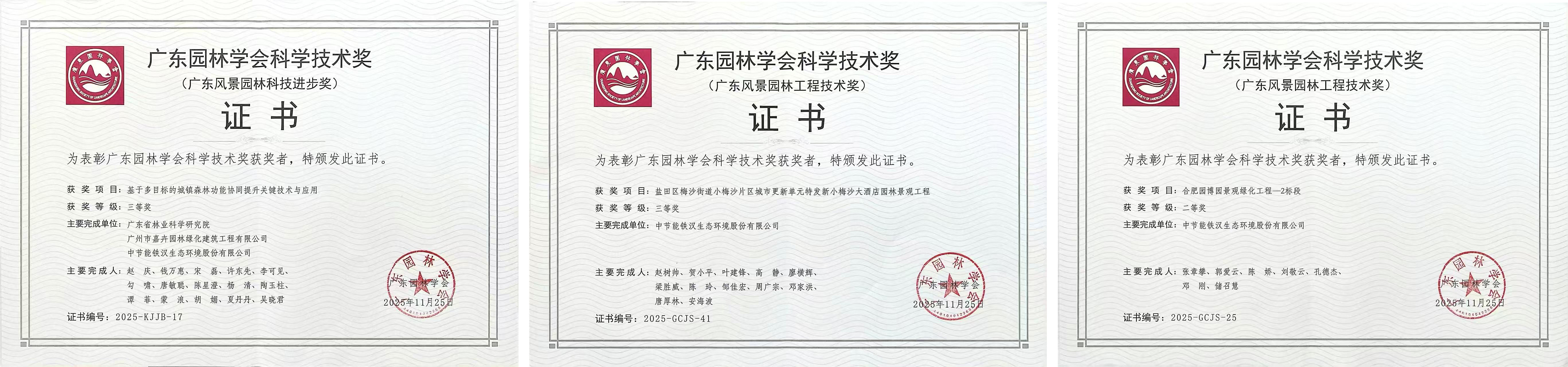 近日,在广东省园林学会七届九次理事会及2025年年会暨学术交流会上,中节能铁汉三个项目荣获表彰,获奖项目涉及景观工程实践与生态技术研发领域。