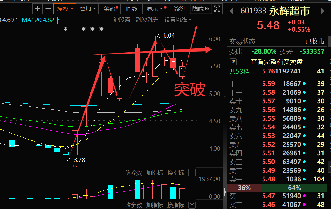 永辉这个票,狼哥的粉丝都很熟悉,之前反复做过几波,永辉超市的逻辑是围绕生鲜核心,通过供应链优化、全渠道布局、会员服务等手段,拓展公司空间,叠加福建题材,技术走势上,这地方,震荡有希望结束,今天如果福建或者消费启动,永辉就有可能突破这个震荡区间,大家跟着成交量走,量起来了再低吸。