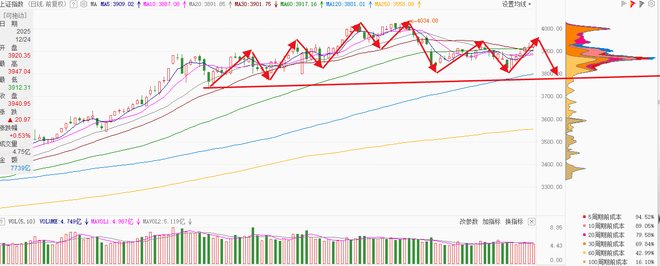 2:上证指数昨天虽然突破日线级别12月8号的高点,昨天的最高点来到了3947点,并且收盘点位也突破了12月8号的高点,3936点。但是昨天创新高的动作,以及六连阳的上涨,并没有得到成交量的确认
