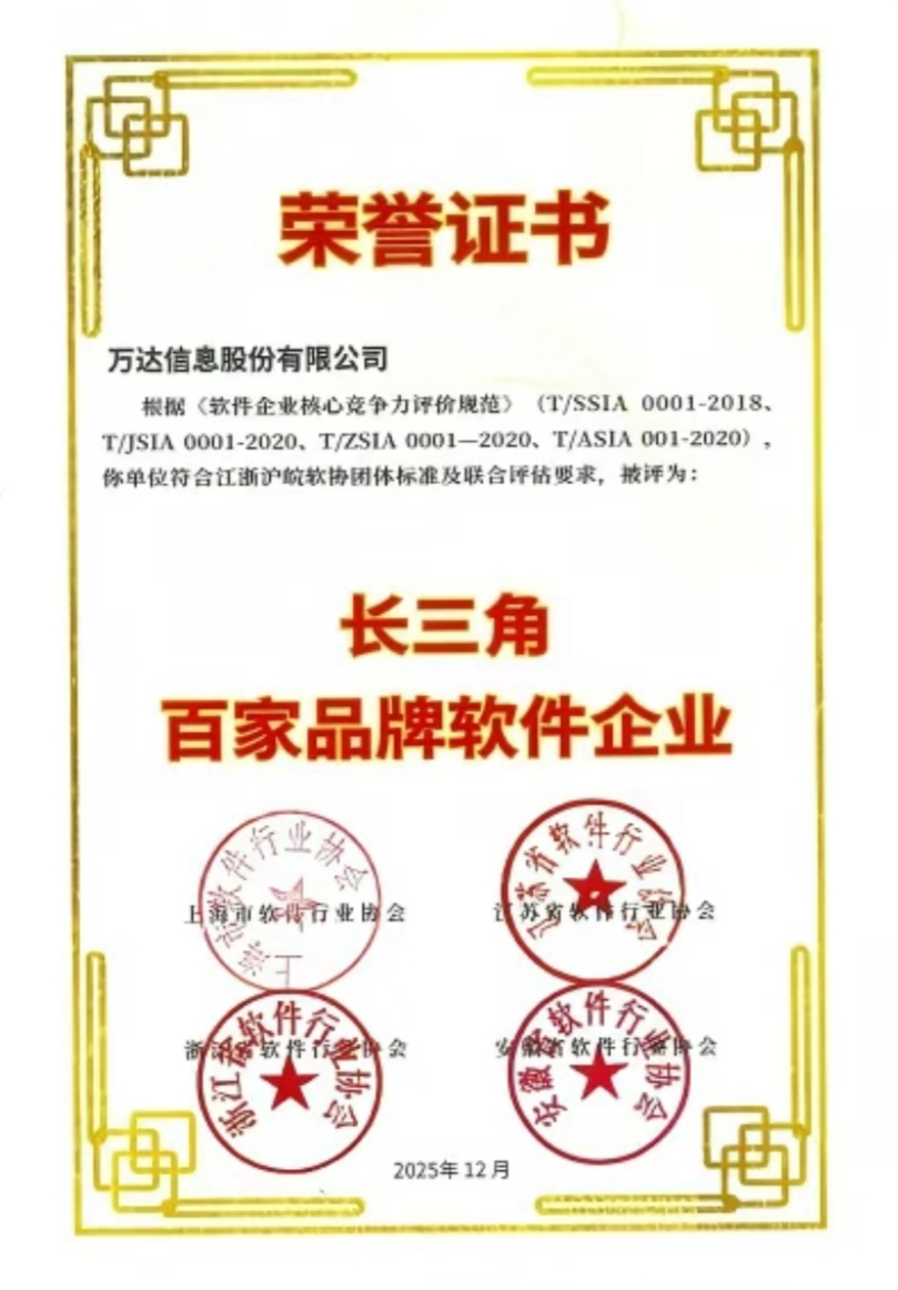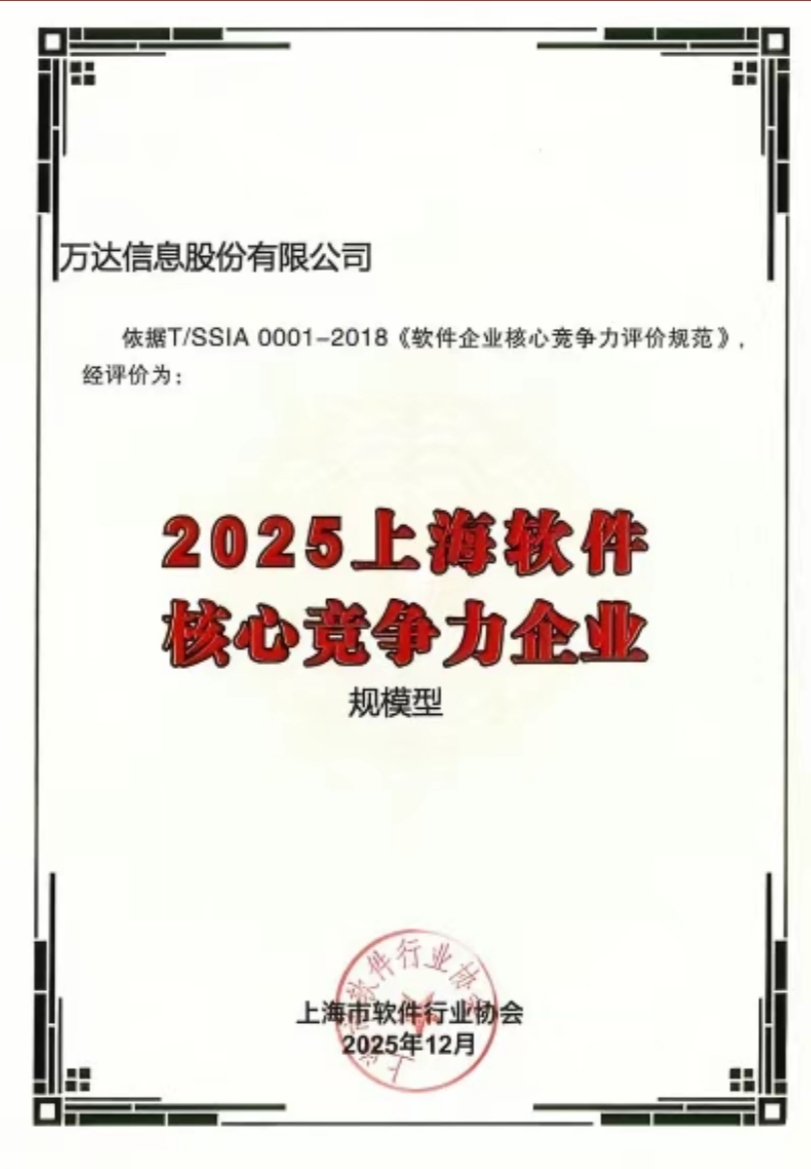 会上,万达信息凭借突出的创新能力及广泛的行业影响力,一举斩获“2025年上海软件和信息技术服务业百强”“2025长三角百家品牌软件企业”“2025上海软件企业核心竞争力企业”三项重磅荣誉。