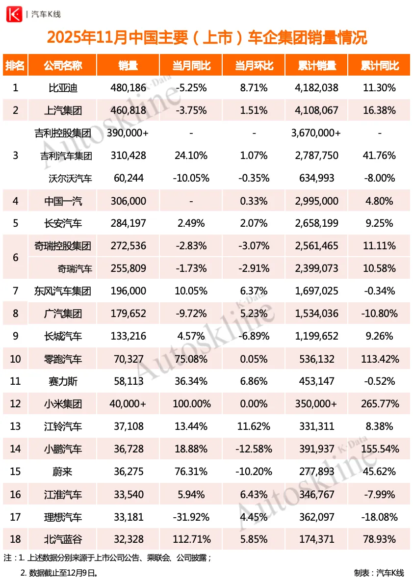 今年11月,在《汽车K线》统计中国主要上市车企集团销量情况中,上汽集团以46.08万辆,稳居第二,以不到2万辆差距落后于比亚迪。