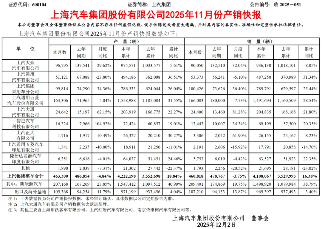 不过,从上汽集团产销快报披露的细分数据看,不同业务板块呈现出分化态势。