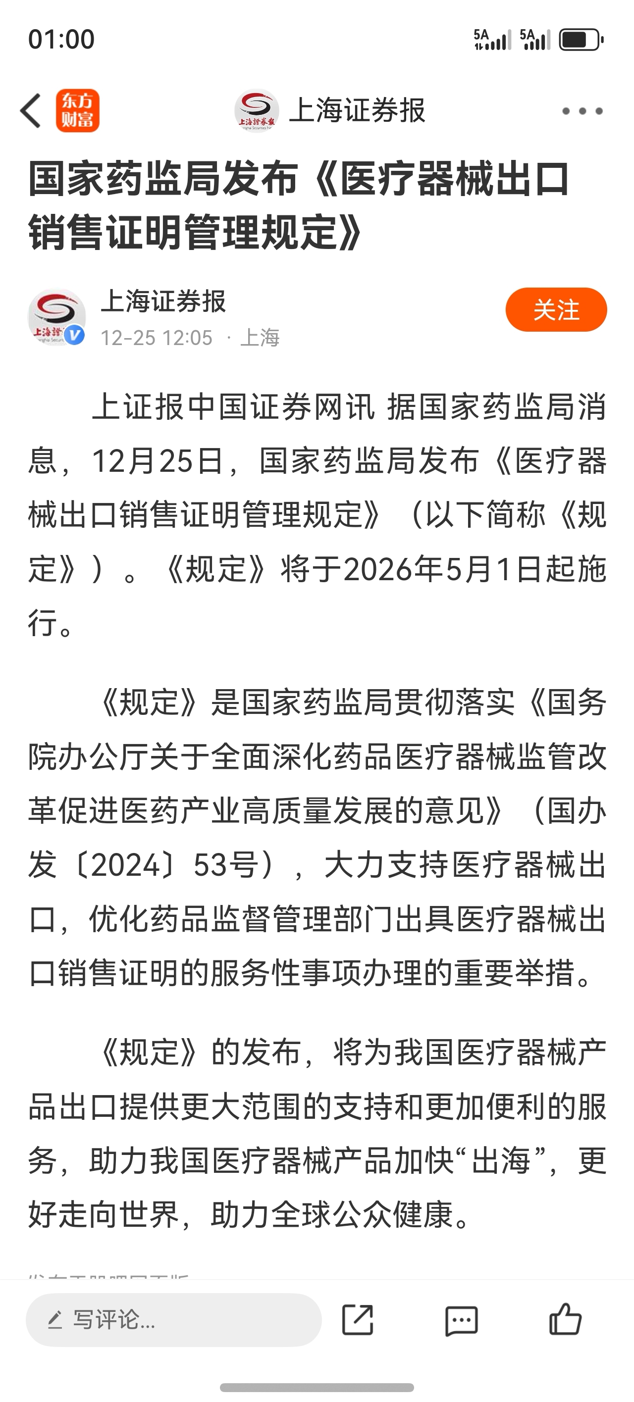 近日,国家药品监督管理局正式发布《医疗器械出口销售证明管理规定》,该规定将于2026年5月1日起施行。这一举措是国家层面为深化药品医疗器械监管改革、促进产业高质量发展、大力支持医疗器械出口所释放的明确政策信号。其核心在于优化监管服务,为企业出口提供更规范、统一、便利的官方背书,旨在系统性降低合规成本,提升中国医疗器械在全球市场的准入效率与竞争形象。