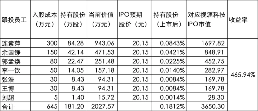 从收益来看,招银国际7名跟投员工以645万元获得视涯科技181.1950万股,原来的持股成本3.5597元/股。按照IPO预期发行市值计算的每股价格约为20元,不考虑股权转让税费情况下,投资5年收益率约为466%。