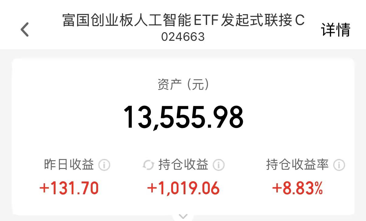 买1000$富国创业板人工智能ETF发起式联接C(OTCFUND|024663)$,理由是:前面买的几次人工智能,一直在盈利的路上,今天看估值回调,继续买一笔。人工智能从年初牛到年尾,这只虽然7月份才成立,但也涨超55%,精准抓到了AI科技年的主流趋势,我觉得行情还没完。咱国内公布数据,今年前11个月,全国数字经济核心产业销售收入同比增长10%,以AI大模型、大数据、物联网等这些数字技术应用业销售收入同比增长14.3%,通过“算力+数据+算法”的融合,AI应用已成为经济增长的核心动力,连大洋彼岸的马斯克也说,预计人工智能的落地应用,或将推动美国经济未来5年实现三位数增长。所以我觉得,接下来AI还会反复活跃,这只覆盖了光模块、算力芯片等核心细分,包括了“易中天”大牛股,跟上趋势妥妥的。