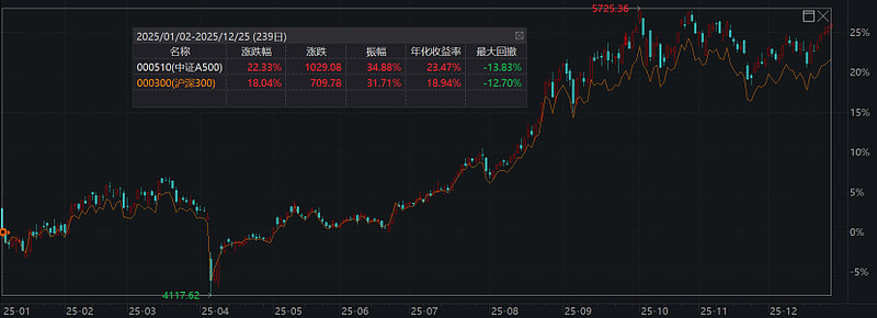 比如说,在今年的大涨行情中,A500指数的涨幅为22.33%,同期沪深300的涨幅为18.04%,大概高出了近5%,尤其是近一个月,因为成长行业的大幅上涨,A500指数跑赢的幅度在明显在拉大。