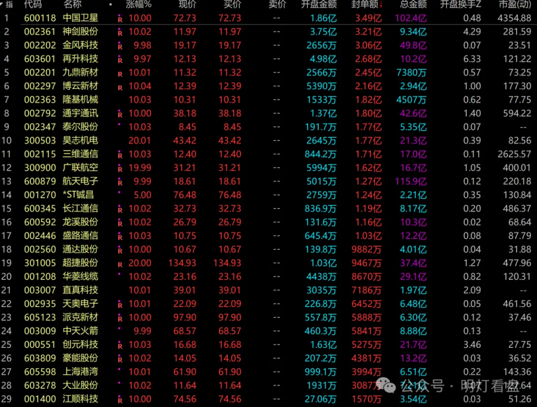 商业航天从强修复,到今天开始加速。神剑股份、再升科技、九鼎新材顶一字加速,西部材料、臻镭科技、信维通信大幅上涨。超捷股份20厘米大号连板,就连中国卫星,也成功2连板。低位的长江通信首板,从高空炒到地面。