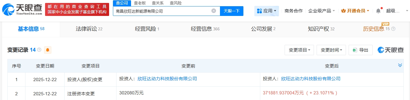 雷达财经讯,天眼查App显示,近日,南昌欣旺达新能源有限公司发生工商变更,注册资本由约30亿人民币增至约37亿人民币,增幅约23%。