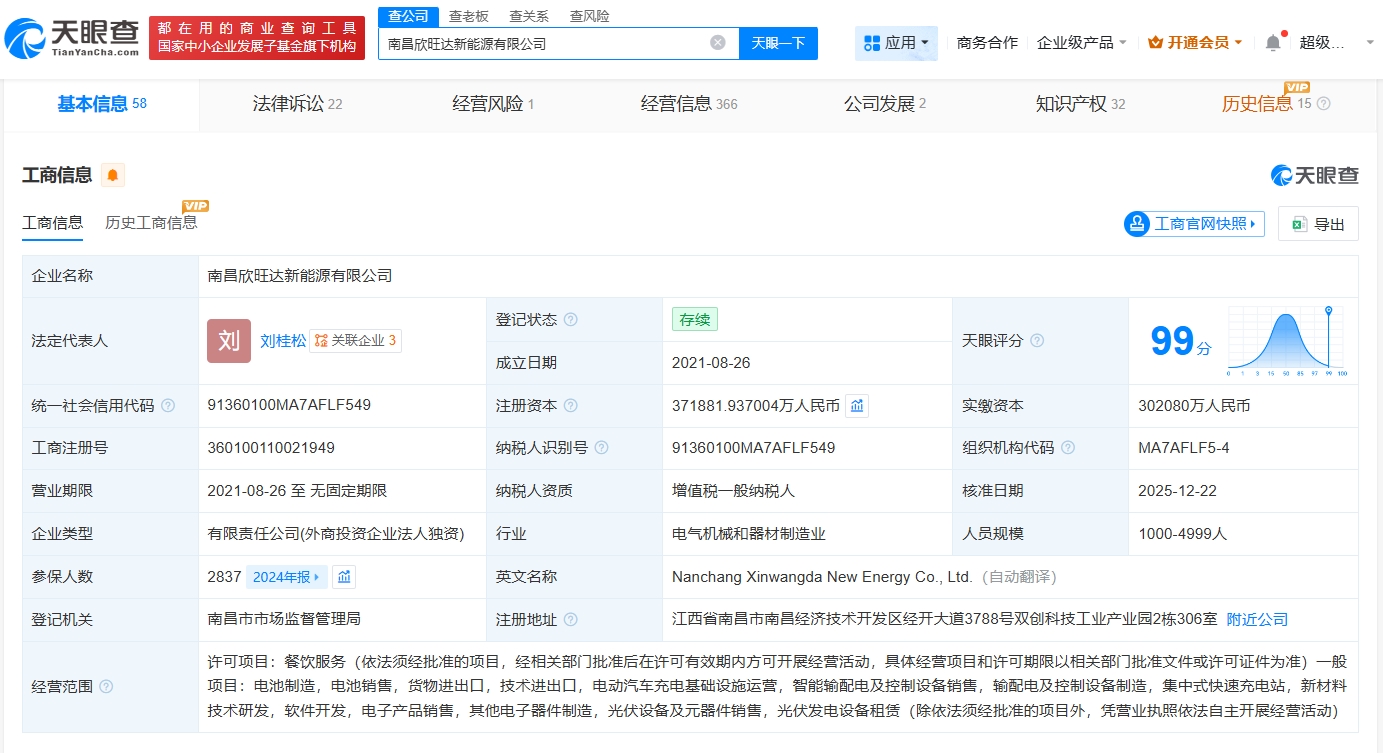 该公司成立于2021年8月,法定代表人为刘桂松,经营范围包括电池制造、电池销售、软件开发、电子产品销售等。股东信息显示,该公司由欣旺达动力科技股份有限公司全资持股。
