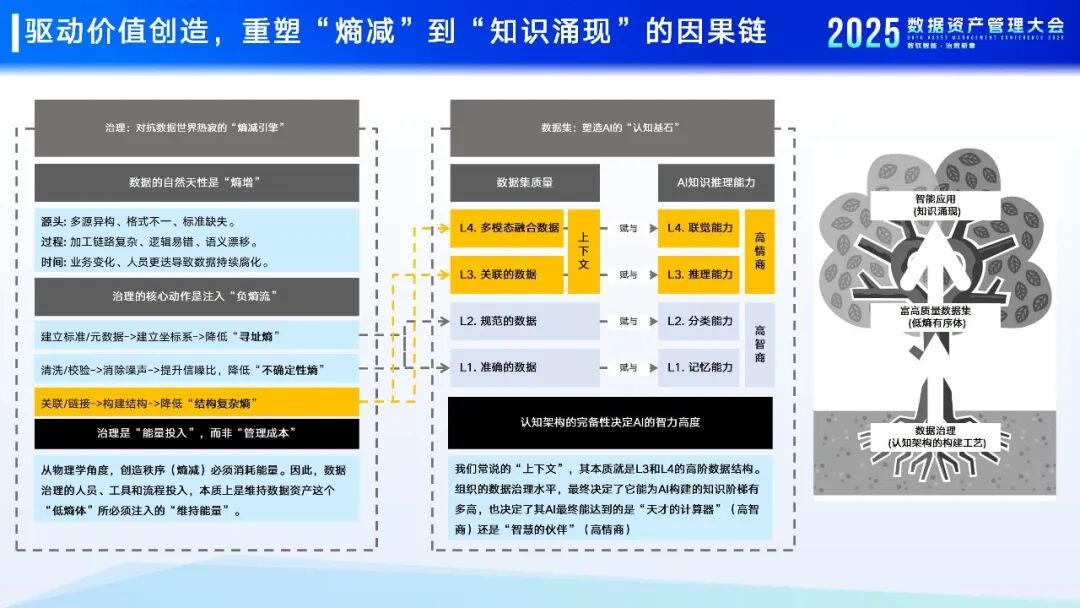 “高质量数据集的瓶颈,已从数据本身的准确性,转移到其承载知识密度的丰富性。”焦烈焱强调。在这个新阶段,数据治理不再仅仅是一个物理层面的“熵减”过程(即减少混乱),更是一个驱动价值创造的因果链重塑过程。这意味着,系统不仅要存储数据,更要理解数据与业务、规则、场景之间的深层联系。企业需要从海量数据中提炼出高密度的知识,为AI提供可理解的“燃料”。