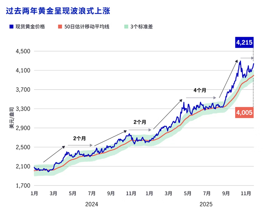 黄金涨势呈现波浪式特征,每轮上涨后均伴随2-4个月的盘整:比如2024年2月至4月,金价上涨19%;2024年6月至10月,金价上涨19%;2025年1月至4月,上涨31%;2025年8月至10月,上涨29%。