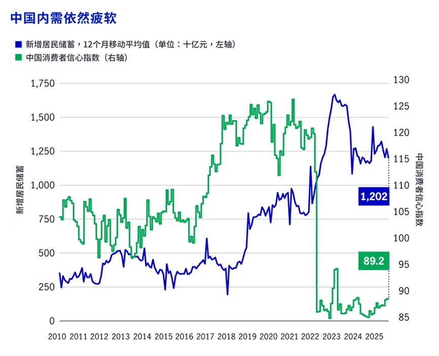 尽管对等关税相关不确定性高企,但得益于政府政策支持及净出口的稳健贡献,2025年中国经济展现出强劲韧性。展望未来,我们认为,2025年末出现的放缓,要求货币和财政政策继续保持宽松,尤其是在房地产行业承压、投资下滑与内需疲软的背景下。此外,我们认为,全球增长与贸易环境的向好,或将是中国经济前景的关键,尤其是随着中美关税相关紧张局势有望在明年有所缓解。