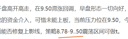中百集团:低开高走后迅速向下调整,有主力拉高出货的嫌疑,盘前说过震荡区间可以做t,成本降低等待明天反包,当前来看,五日线8.52是有强支撑的,明天看五日线放量上行表现,大概率是8.51-9.10震荡调整。