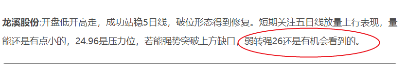 龙溪股份:今天开盘高开高走,强势暴力拉升,迅速突破早评说的25.60压力位,斩获涨停板。跟昨晚收评预测说到的26目标价格已达成,恭喜同车的朋友,圣诞礼物接收了吗?