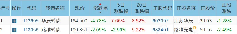 今天下跌的可转债数量比昨天更少。华辰转债在昨天的文章中有分析到,目前已经进入转股期,而当下30%+的溢价率明显偏高,且接下来所有的冲高都可能是大股东减持可转债的节点,所以并不看好其有什么持续性的行情