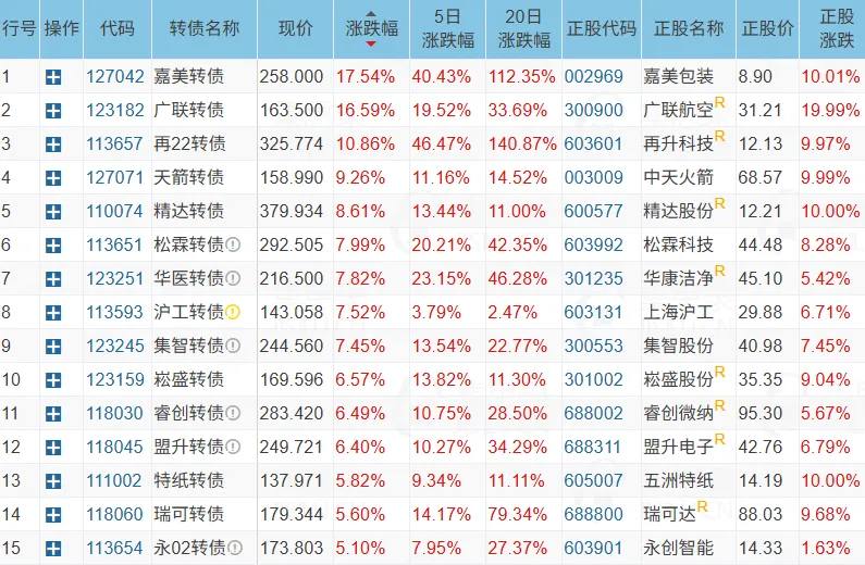 可转债今天表现较好,326只可转债上涨,54只可转债下跌,可转债等权指数上涨1.00%,涨幅超过5%的可转债有15只,具体名单如下: