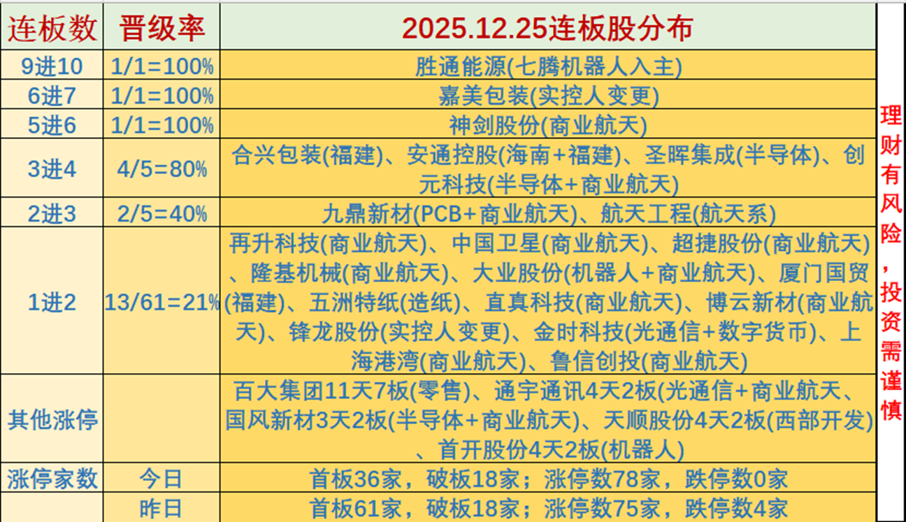 连板晋级率升至64%, 3板以上连板股仅有海南发展、安记食品未能实现晋级。昨日强势反包的高位股百大集团继续强势涨停,昨日5进6失败的鹭燕医药今日继续扛住分歧盘中一度刷新阶段新高。随着自然板最高标神剑股份缩量晋级,带动商业航天概念继续掀起涨停潮。而连板最高标胜通能源仍不惧严重异动监管,缩量一字涨停晋级10连板,带动短线接力情绪持续升温的同时,多只叠加并购重组或股权转让品种维持强势,嘉美包装走出10天8板,天普股份强势涨停再度创出历史新高,或就此为短线情绪维持高热度打下基础。