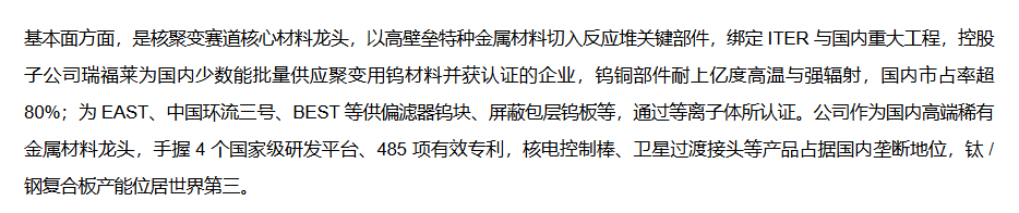西部材料002149:可控核聚变。西部材料昨天大涨后,没想到今天居然再度大涨,收盘还能涨停,走势比预期的更加强悍。可惜的是,早盘盘中逢高就已经把仓位全部出完了,后面也没有接回。整体来说,这波行情已经是大肉了。虽然今天收盘是涨停的,但是收盘没有封住,力度还是不够。虽然看这个趋势还是在向上,但是既然今天已经全部走了,后面就准备不玩它了,算是落袋为安吧。知足常乐。